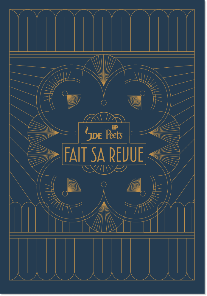 DA : identité graphique Art Déco, bleu nuit et or. Poster collector aux typographies dorées ciselées, invitation façon ticket du cabaret. Glamour et sophistication avec une pointe de folie assumée.