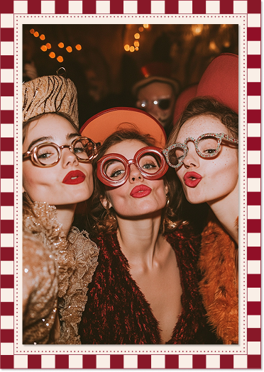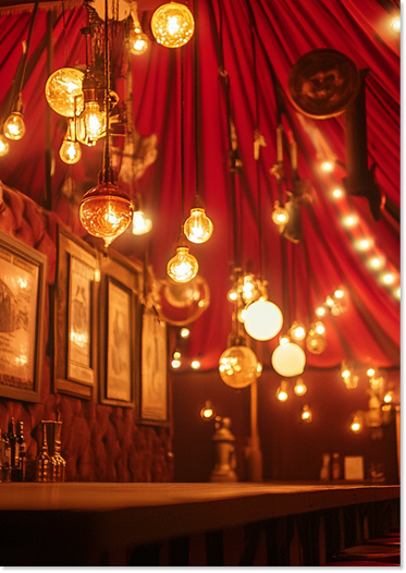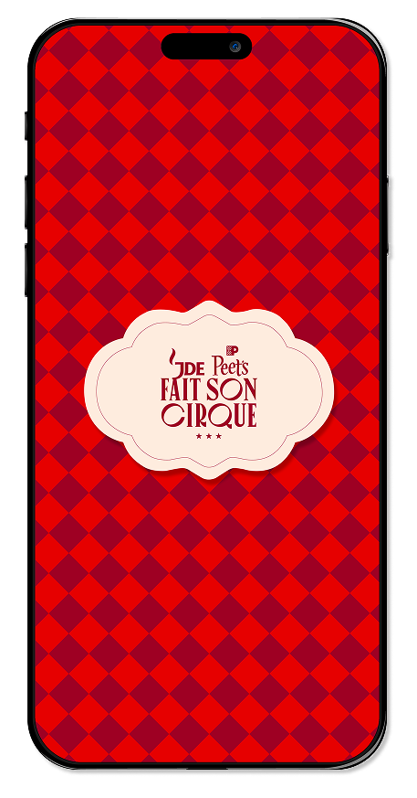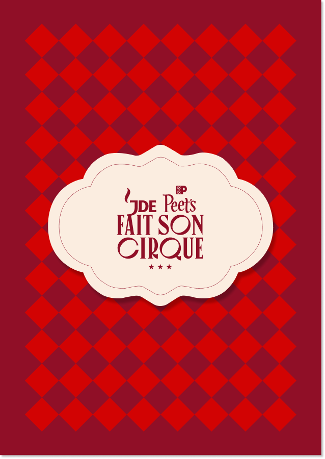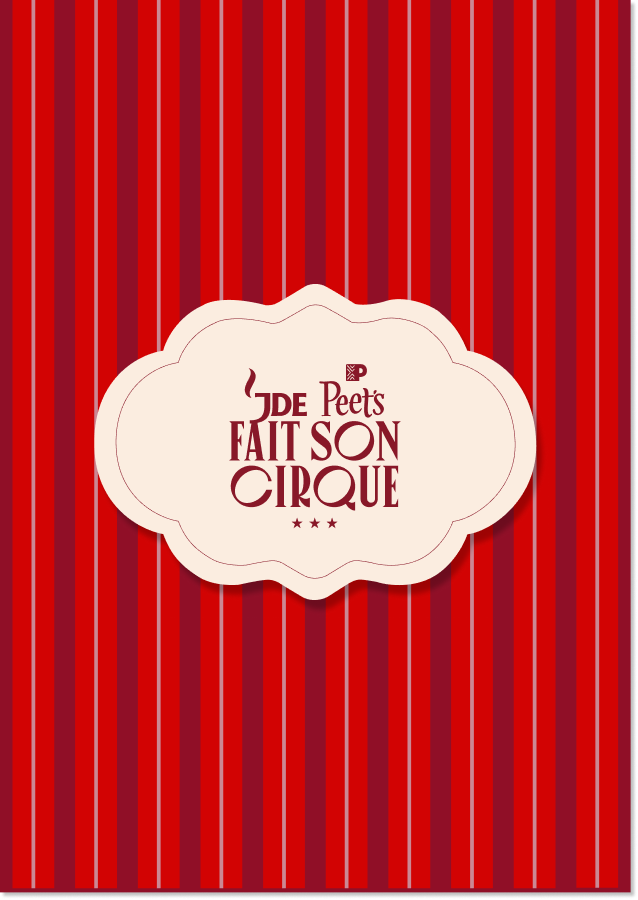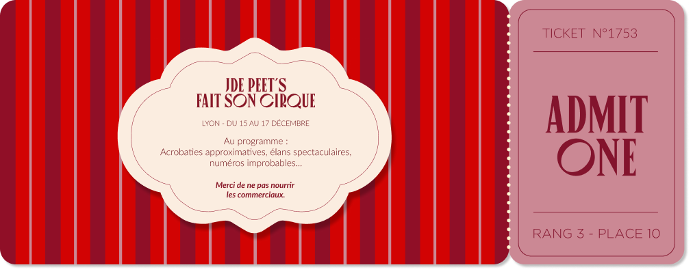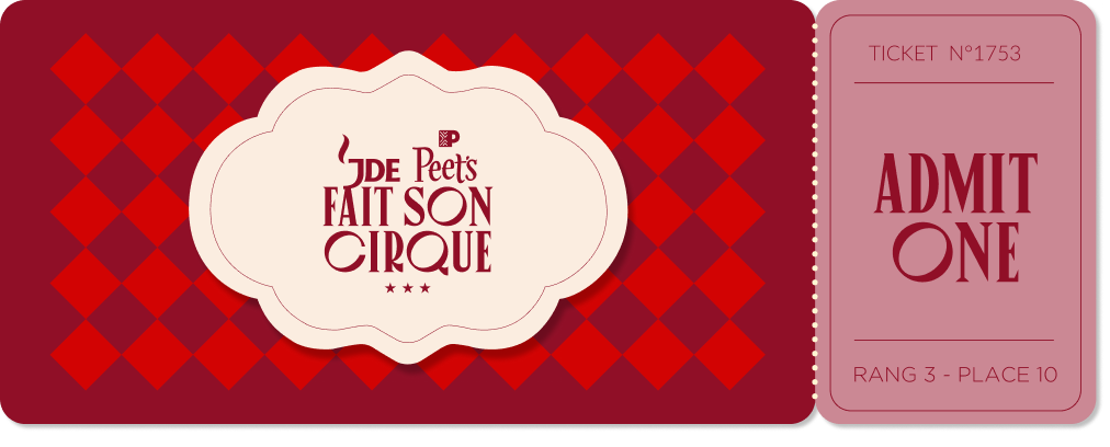 Crème, rouge vif et bordeaux profond. Ticket d'entrée collector dentelé, affiches très graphiques, et illustration à la fois drôle et avec beaucoup d’impact. Moodboard déco du chapiteau en velours et guirlandes dorées. Un cirque élégant, à la fois vintage et moderne, terriblement envoûtant et loin des clichés.