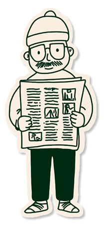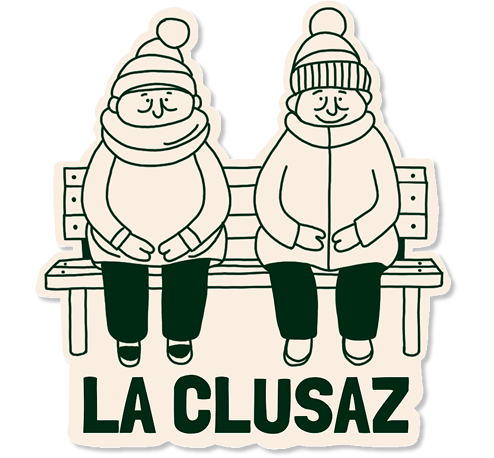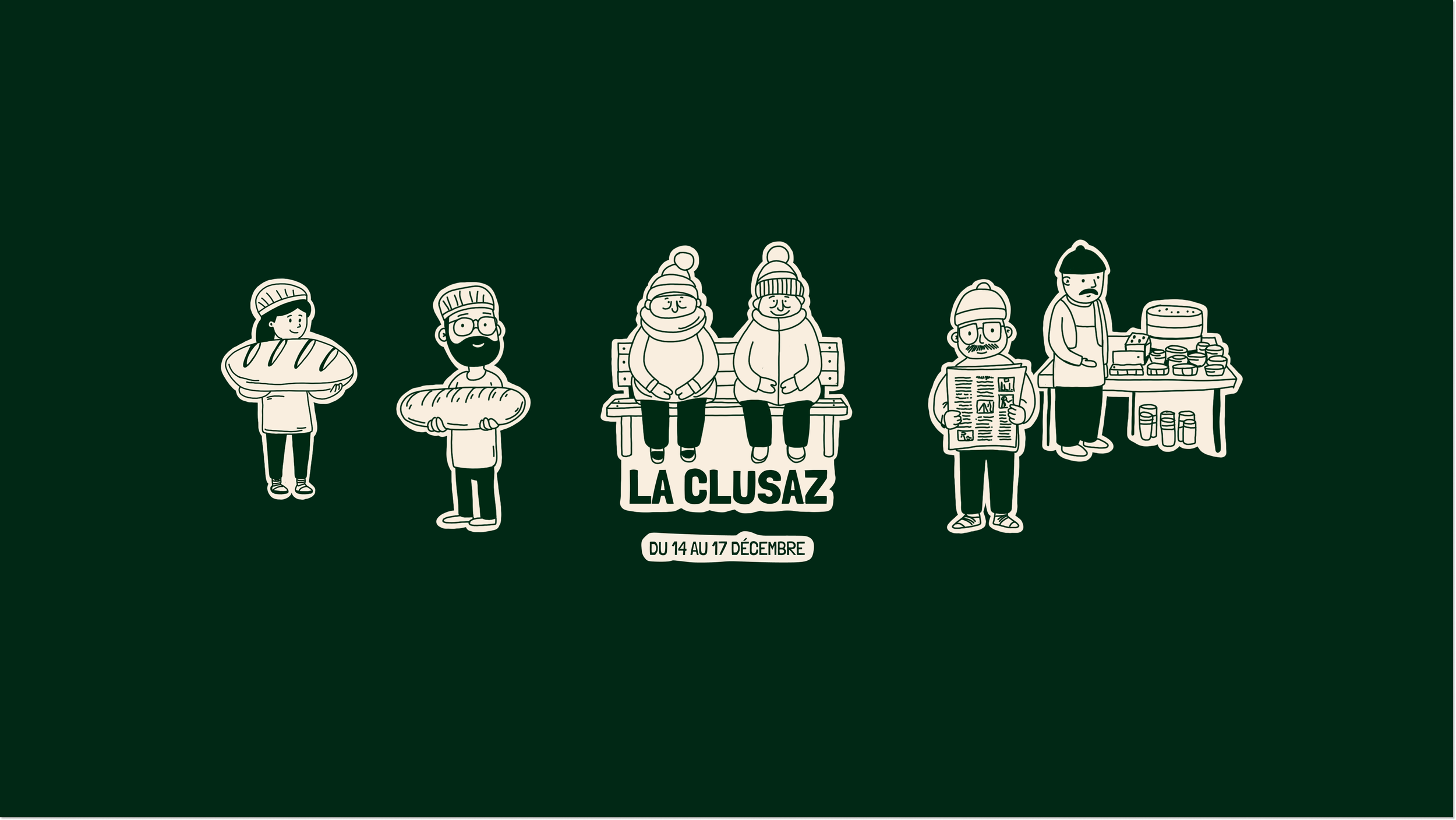 DA : illustration originale avec personnages du village savoyard, carte postale collector, identité graphique colorée et décalée, invitation “La Clusaz Gazette”.